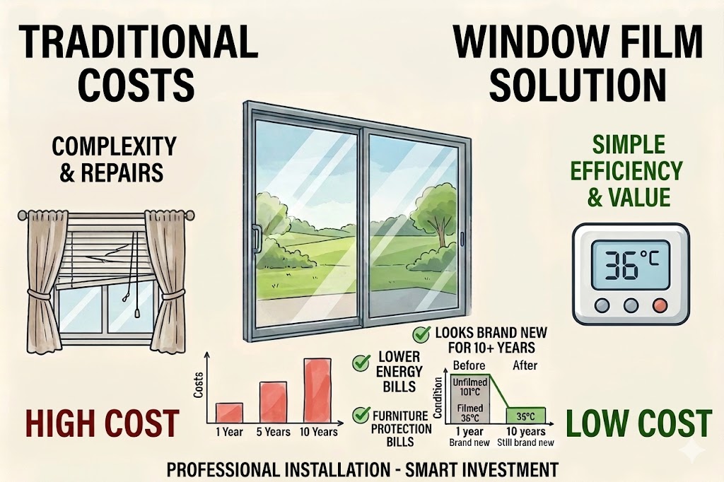 1. Window Film: A one-time installation that protects your furniture, lowers your solar heat gain, and looks brand new for over a decade.